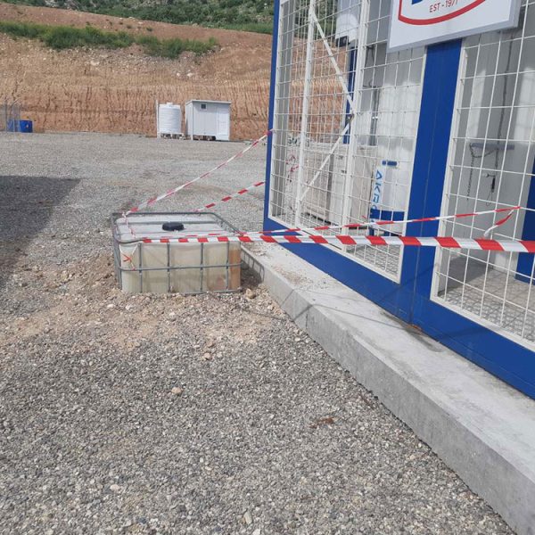 4. Install(1H*1W*1*D) plastic chemical slops tank. Top connected to slops drain sand buried with access lid for emptying.