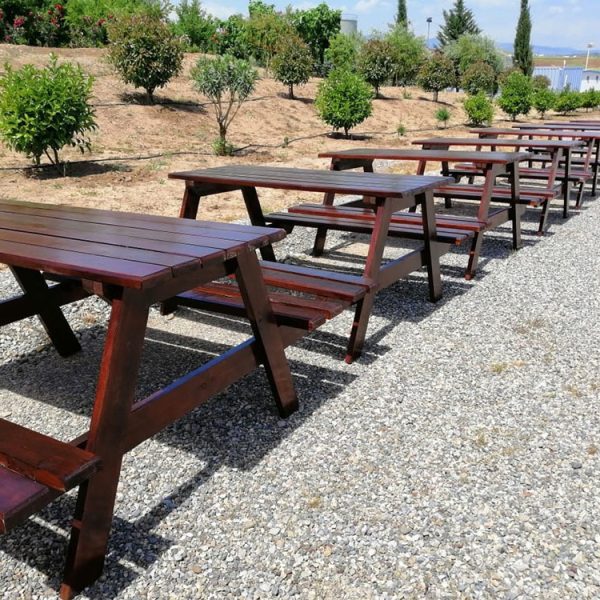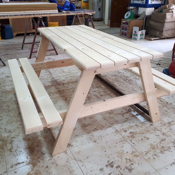 Fabricate and install Garden table as shown below picture- Total quantity – 10 Nos •The table is to be fabricated on suitable treated natural wood. •Wood Primer and natural wood color paint to be applied Dimensions 1.5*1.5 m in the plan.